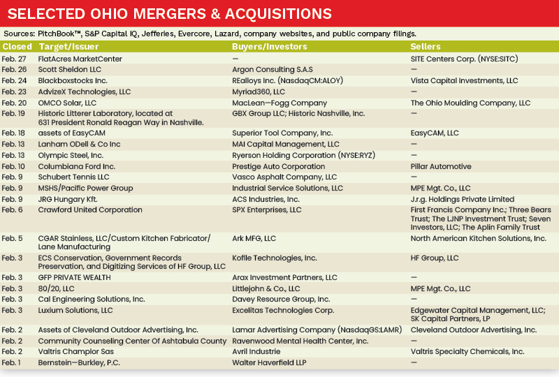 The Cleveland M&A market experienced a 46.9 percent increase in activity in the first two months of 2026 as compared to the same period in 2025, with several noteworthy transactions completed by both strategic acquirers and private equity firms. REalloys Inc. MAI Capital Management, Vasco Asphalt Company, Walter Haverfield, and Davey Resource Group completed strategic acquisitions during the month, while Crawford United and MPE Partners realized successful sale transactions.