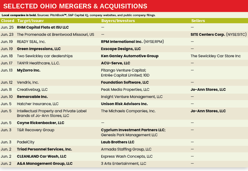 The Cleveland M&A market experienced an uncharacteristically slow June that resulted in 30 percent fewer transactions completed than in the same period in 2024. However, there are still several noteworthy transactions completed by both strategic acquirers and private equity firms. RPM International, ACU-Serve, Foundation Software, and Unison Risk Advisors all completed strategic acquisitions, while Cyprium Investment Partners completed a significant platform investment. Additionally, Triad Personnel Services, Cleanland Car Wash, and A&A Management Group all realized successful exits during the month.