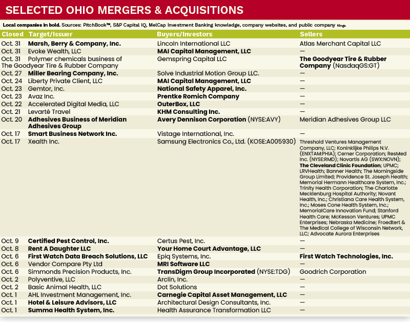 The Cleveland M&A market experienced a 10 percent increase in activity in October 2025 compared to the same period in 2024. Moreover, notable Cleveland-based companies, such as Avery Dennison, TransDigm, and Prentke Romich Company all completed strategic acquisitions, while Miller Bearing Company and Summa Health System transitioned to new ownership, highlighting the region’s dynamic deal-making environment.