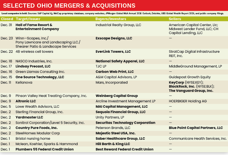 The Cleveland M&A market experienced a ~14 percent increase in activity in December 2025, as compared to the same period in 2025. While total annual deal volume increased nearly 6 percent in 2025, as compared to 2024. Moreover, notable Cleveland-based companies, such as MAI Capital Management, Sequoia Financial Group, Majestic Steel USA, and National Safety Apparel each completed strategic acquisitions, with the private equity firm Weinberg Capital Group also completing a platform acquisition.