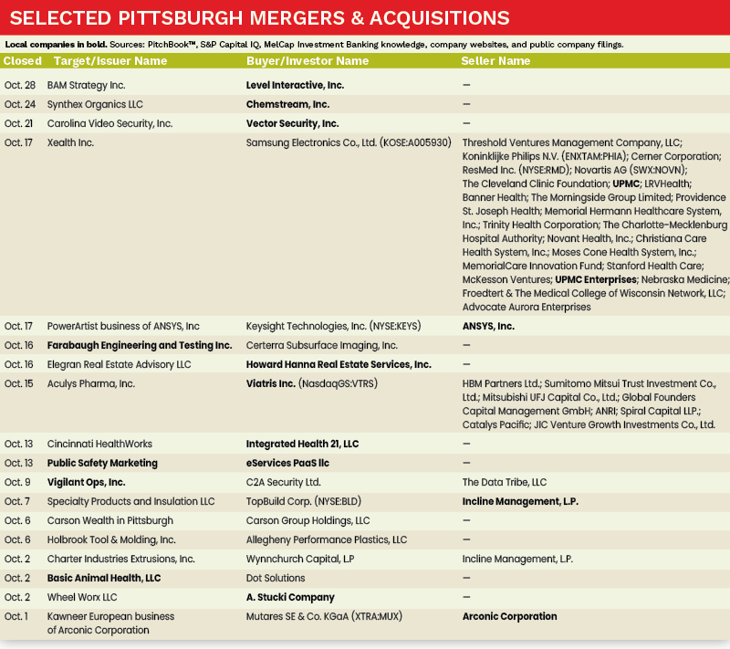 The Pittsburgh M&A market experienced a 20 percent increase in activity in October 2025 compared to the same period in 2024. Moreover, notable Pittsburgh-based companies, such as Viatris, Chemstream, and Level Interactive all completed strategic acquisitions, while Ansys and Arconic Corporation completed strategic divestitures, demonstrating the diversity of transactions in the region.
