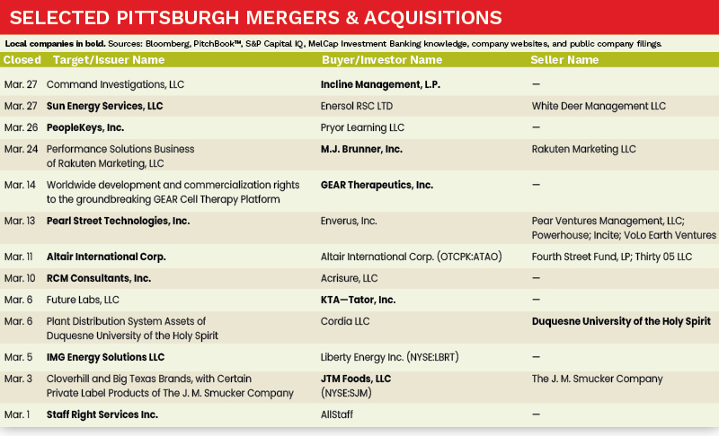 The Pittsburgh M&A market experienced a 30 percent increase in activity in March 2025 compared to the same period in 2024. Pittsburgh-based companies GEAR Therapeutics, JTM Foods, and KTA-Tator, all completed acquisitions during the month of March.